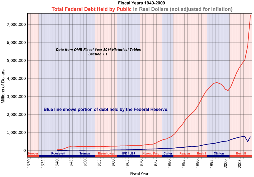 Amazingly, although Federal debt as a percent of GDP declined from 1945 to 1981, the amount of the debt in real dollars never declined by any significant amount during that period. That means the Federal debt from WWII was never paid down. It merely became a revolving line of credit for the Federal government. As GDP increased and the value of the US dollar declined due to inflation, the government increased its credit limit. So, despite increased borrowing during the 1970s (resulting from VietNam war expenses), debt as a percent of GDP reached a low in 1981. The only time since 1940 that the dollar amount owed to the public by the Federal government has actually been paid down by any significant amount was during the final few years of the Clinton administration.
